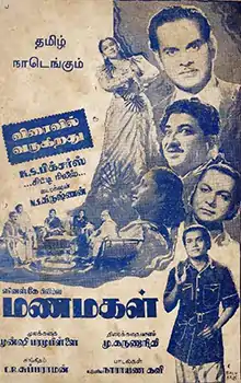 Manamagal (transl. The Bride) is a 1951 Indian Tamil-language drama film, directed and produced by N. S. Krishnan. The film stars Padmini, Lalitha, S. V. Sahasranamam and T. S. Balaiah in lead roles. It is based on the Malayalam play Suprabha by playwright Munshi Paramu Pillai. The film was dubbed into Telugu as Pelli Kuthuru.[2]