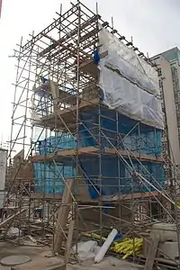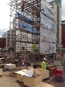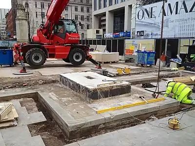 The suitability of St Peter's Square re-emerged in 1925 during discussions about the proposed art gallery and consideration was given to moving the cenotaph to Piccadilly.[4] Over the following century the square itself changed radically. In 1924 the square was small and, apart from the Midland Hotel most of the surrounding buildings were no more than four stories high; but then an entire block on the north side was cleared in the 1930s for the construction behind it of the Manchester Central Library; and then further blocks to the northeast were cleared in 1980 to open the square to the Manchester Town Hall Extension and the Collier Street facade of Manchester Town Hall. From 1992 St Peter's Square became the location of one of the main city centre stops for Manchester's Metrolink tram system; such that stanchions and overhead power lines increasingly intruded on the cenotaph, and platforms abutted directly onto the low wall around the post-WWII garden of remembrance. In March 2011, Manchester City Council began a public consultation on moving the cenotaph to an alternative site (within the 1980 extension of the square), to allow for further expansion of the tram network. The plans had a mixed reception. Some objections were made by the public but there was support from veterans, church, and heritage groups. The relocation was approved in 2012, and in January 2014 the cenotaph was dismantled before it was cleaned and restored. The burial crypts were to remain beneath the new tram-lines, and so were provided with a concrete lid, while the memorial cross, also cleaned and restored, was returned to its original position above the crypts. In 2014 the cenotaph was reconstructed in a new memorial garden on the opposite side of the square aligned with Manchester Town Hall's southern entrance. The city council commissioned conservation architects Stephen Levrant Heritage Architecture to manage the relocation and design the new setting which places the cenotaph, obelisks and stone on a plinth in an oval surrounded by a low wall.[33] The garden opened to the public in September 2014. The cenotaph was damaged in the first week when skateboarders began using the area as a skatepark. Repair work costing £4,000 started shortly afterwards, and extra security measures (including 24-hour CCTV) were put in place.[34][35][36][37]