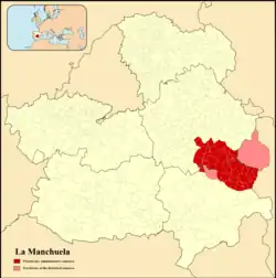 The historical Manchuela comarca included the municipalities of Tarazona de la Mancha and Villalgordo del Júcar, and the Requena-Utiel comarca which had been part of the Cuenca Province until 1851 and is now part of the province of Valencia, Valencian Community, except for Mira.[1]