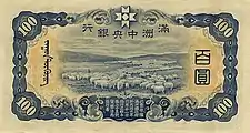 100 yuan | Blue and yellow-orange | Flag of Manchukuo; building | Denomination | 1933 |