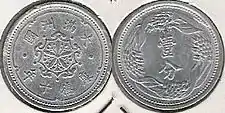 | 5 fen | 21 mm | 1.6 mm | 1.2 grams | Aluminum | Plain/Smooth | Big numerical "5" inside a circle; text "• 國洲滿大 • 年十儀溥" | Imperial Seal of Manchukuo above denomination; floral wreath below | 1940-1943 (Kangde 7–10) | |