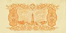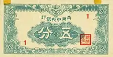 5 fen | Blue-green | Imperial Seal of Manchukuo; denomination | Tower | 1945 |