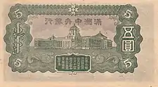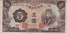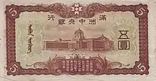 5 yuan | Dark brown and tan | Flag of Manchukuo; building | Denomination | 1933 | |