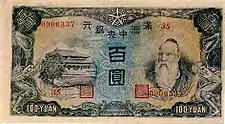 1,000 yuan | Dark brown and violet | Dacheng Hall in the Temple of Confucius, Confucius | Headquarters of the Central Bank of Manchou, Xinjing | 1944 |
