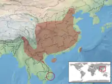 India (Arunachal Pradesh), Myanmar, Laos, Vietnam, Taiwan, China (Anhui, Beijing, Chongqing, Fujian, Gansu, Guangdong, Guangxi, Guizhou, Hainan, Hebei, Henan, Hubei, Hunan, Jiangsu, Jiangxi, Liaoning, Shaanxi, Shanghai, Shanxi, Sichuan, Tianjin, Tibet, Yunnan, Zhejiang)[1]