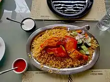 Mandi (Arabic: مندي) is a traditional dish that originated from Hadhramaut, Yemen.[2] consisting mainly of meat and rice with a special blend of spices, cooked in a pit. It is popular and commonly consumed in most areas of the Arabian Peninsula, especially between the Yemeni people, and even considered a staple dish in many regions. It is also found in Egypt, the Levant, Turkey, Southeast Asia, and India.[3][4]