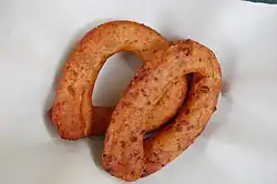 A mandoca is a Venezuelan deep fried cornmeal ring that is usually eaten with butter, cheese and coffee while still hot. It is usually served at breakfast, and it is most popular in Zulia state of the country. The mandoca is one of a variety of specialties exclusively created in the western state of Zulia.[1]