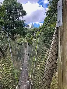 The reserve 18.5 ha (46 acres) of kahikatea forest on the east bank of the river, was purchased by the Native Forests Restoration Trust in 2001. Kahikatea forest once covered 41,000 ha (100,000 acres) in the Waipa Ecological District, now reduced to 158 ha (390 acres), of which 52 ha (130 acres) are in the Mangapu valley, though over 70 ha (170 acres) has been felled since 1975.[11] A major drainage scheme was carried out just upstream from the reserve in the 1930s, including emptying of a lake.[12] The forest floods in winter[13] and flood protection would be uneconomic.[14] Some kahikatea in the reserve are about 120 years old. The reserve also has swamp maire, mataī, tītoki and pukatea.[11] Te Araroa long-distance walkway passes through the reserve and crosses the river on a suspension bridge.[15]