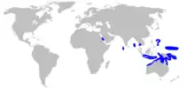 Although uncommon, the mangrove whipray seems to be widely distributed in the Indo-Pacific; it has been reported from the Red Sea, South Asia including the Maldives and the Andaman Islands, the Gulf of Thailand, the Malay Archipelago (except Sumatra), New Guinea and northern Australia, and various islands including Guam, Fiji, the Solomon Islands, and Micronesia.[1][2] This bottom-dwelling species typically inhabits shallow water close to shore, though adults have also been recorded offshore to at least a depth of 85 m (279 ft). Juvenile rays frequent brackish habitats such as mangroves and estuaries. By contrast, adults prefer areas of sand, sand and rock rubble, or hard bottom, and are often found in lagoons or on coral reefs.[1][2]