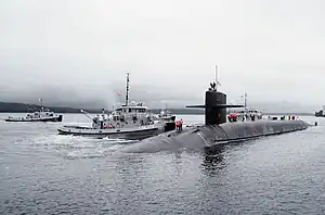 ![]() USS Ottumwa (YTB-761) and Manhattan (YTB-779) assist in the docking of the nuclear-powered strategic missile submarine USS Ohio (SSGN-726) at Delta Pier, Naval Submarine Base Bangor, Washington. | |