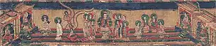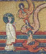After carefully studying the painting, and comparing it with the Manichaean materials found in Xinjiang, the westernmost region of China, the members of Yoshida's research team concluded that the painting is Manichaean because it includes a priest wearing a white robe with red piping that is characteristic of Manichaean priests.[2] According to the art historian Zsuzsanna Gulácsi, the white robed priest—the silhouette of whose face against the green halo—is a depiction of the prophet Mani.[5]