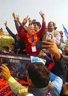 Sisodia was one of the key founding members of the Aam Aadmi Party (AAP). He became a member of its Political Affairs Committee. He was elected as a Member of the Legislative Assembly in the December 2013 Delhi Assembly election, when he defeated Nakul Bhardwaj, a Bharatiya Janata Party candidate, by 11,476 votes in the Patparganj constituency of East Delhi.[12][13] In the February 2015 Delhi Assembly election, which resulted in a landslide victory for AAP, he was again elected from Patparganj, defeating Vinod Kumar Binny of the Bharatiya Janata Party by over 28,761 votes.[14] In 2020 Delhi Legislative Assembly election, he again defeated Ravinder Singh Negi, a BJP candidate by over 3000 votes.[15]