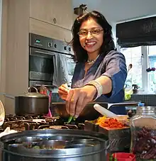 Manju Malhi (born c. 1972) is a British-born chef and food writer, specialising in Anglo-Indian cuisine. She was brought up in North West London where she grew up surrounded by Indian culture, traditions and lifestyles. However, she spent several years of her childhood in India where she explored and experienced the vast and varied cuisines of the country. Malhi has come up with her own self-styled "Brit-Indi" style of food, which mixes Indian and Western influences.