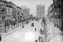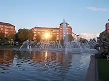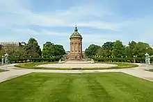 The Water Tower (German: Wasserturm) is a well-known landmark of Mannheim, Germany. The water tower was built from 1886 to 1889 on the present Frederick Square (Friedrichsplatz) by Gustav Halmhuber. The tower, which is 60 meters high and 19 meters in diameter, was Mannheim's first urban water tower. It initially had to meet with the required standards as a drinking water supply while maintaining steady water pressure. After the construction of the higher Luzenberg water tower in 1909, the Mannheim water tower served as an aboveground water tank until 2000.