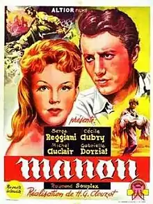Manon (French pronunciation: [manɔ̃]) is a 1949 French drama film directed by Henri-Georges Clouzot and starring Serge Reggiani, Michel Auclair and Cécile Aubry. It is a loose adaptation of the 1731 novel Manon Lescaut by Abbé Prévost.[1] The film won the Golden Lion at the Venice Film Festival, and was a popular success with over three million tickets sold in France.[1]