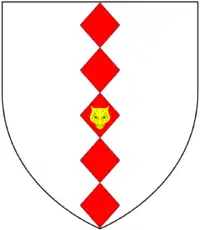 Arms of Hele: Argent, five fusils in pale gules on the middle one a leopard's face or