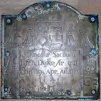 A monumental brass coffin plate of Richard Duke (1567–1641) survives in Otterton Church, now affixed to the west wall, originally affixed to his coffin within the Duke family vault in the church.[13] The Latin inscription is as follows: