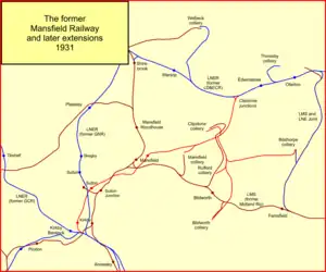 The Lancashire, Derbyshire and East Coast Railway obtained authorisation for a branch line to Mansfield, but the LD&ECR was perpetually in financial difficulty and abandoned the plan.[4] (In 1907 the Lancashire, Derbyshire and East Coast Railway was absorbed by the Great Central Railway.[5]) Attempts to persuade the Great Northern Railway and the Great Central Railway at different times to build a line to, or through Mansfield had met with failure.