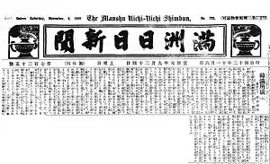 The Manshū Nichi-Nichi Shimbun (満洲日日新聞, lit. 'Manchuria Daily News') was a Japanese-language newspaper owned by the South Manchuria Railway Company and printed from 3 November 1907 until Japan's defeat in the Second World War in 1945. Printed in Dairen (now Dalian), capital of the Japanese-controlled Kwantung Leased Territory, and from 1938 in Mukden (now Shenyang), it was the most influential newspaper serving the growing Japanese settler population in northeastern China.[1][2] In 1927, it merged with the rival Ryōtō Shimpō (遼東新報, lit. 'Liaodong News') and was renamed the Manshū Nippō (満洲日報, lit. 'Manchuria Daily Report'), before returning to its original name in 1935 following another merger with Dairen Shimbun (大連新聞, lit. 'Dairen News'), whereupon it gained a complete monopoly on Japanese-language news in what had become the Japanese puppet state of Manchukuo.[1][3] In 1944, it briefly changed its name back to Manshū Nippō before going out of print in 1945 following Japan's defeat in the war and subsequent withdrawal from Manchuria.[2]