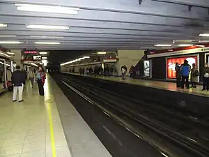 Manuel Montt is an underground metro station on the Line 1 of the Santiago Metro, in Santiago, Chile. It was opened on 22 August 1980 as part of the metro extension from Salvador to Escuela Militar.[2] Initially its walls were covered with stoneware ceramic tiles of blue and orange colors,[3] some of which loosen or fall off as a consequence of the 2010 Chile earthquake. The total replacement of its wall tiles is underway.[3]