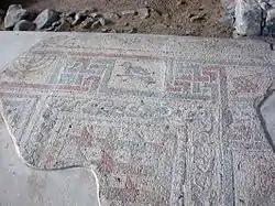 In relation to this, the majority of the remaining floor was primarily composed of geometric patterns. Geometric patterns were popular before as in the earliest layer to an extent, but likely were especially valued in an aniconic society. However, it was not well preserved in the upper layers due to the aforementioned destruction of uncertain cause and additional construction that occurred by the local populace afterwards.[2] Despite this, the mosaic floor from the initial stage of construction was better preserved as it had been filled in with approximately 30 centimeters of dirt to lay the new aniconic floor, although not many artifacts were found within it.