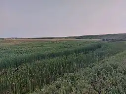 From the Cypress Hills, Maple Creek flows northward through valleys and coulees where it is joined by several creeks before opening up onto the plains. The town of Maple Creek[5] is along the course of the river and is located near the base of the Cypress Hills. Just north of the town, Maple Creek is joined by its longest tributary, Gap Creek.[6] From there, Maple Creek flows into Junction Reservoir. Maple Creek continues northward from the reservoir where it crosses the Trans-Canada Highway. From the Trans-Canada Highway, it continues northward where it is joined by several small creeks, such as one that flows in from Bitter Lake, en route to Bigstick Lake. At the western end of Bigstick Lake, a restriction dam was built in 1974 by Ducks Unlimited Canada that created a marsh that covers an area of about 100 to 200 hectares.