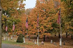 The Maple Grove Cemetery occupies an area of gently rolling hills, and contains a variety of nineteenth and twentieth-century monuments interspersed among curving paths and tall maple trees. An 1890 Romanesque Revival receiving vault is located near the entrance. It has a steeply pitched gable roof and a three-part facade divided by string courses: checkerboard stone patterns at the top, a section containing the top of the arched door opening in the middle, and the door itself on the lower level. A 1934 stone entrance gate/wall made of large blocks set in a matrix of smaller cobblestones surrounds the entrance.[2]
