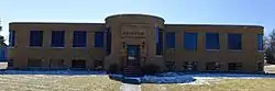 Building #7, as it was known, is a single-story, brick structure, with a full basement. The building was locally designed and constructed by employees of the Maquoketa Company in the Moderne style. This is the only building in the county that was built in this style.[2] It features simple lines, shapes, and planar surfaces. Both the main entryway on the north side of the building and its corners are rounded. The building sits on a 5-acre (2.0 ha) lot, and is fronted by a park-like setting, which is how the building was always situated. The factory sat immediately behind it. In the 1950s the property was planted with evergreen trees, shrubs, and flowers. They were removed over the years.