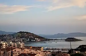 ![]() The first hypothesis of the first modern investigator, J. Keil, is that Marathesion was southwest of Nuova Scala, but not as far as Ambar Tepe. He draws a map placing Marathesion at the port of Kuşadası[2] and gives a picture of Kese Dağı with Pigeon Island.[3] A modern photograph is given above. He places Ambar Tepe, not otherwise known in this region, on the south of the promontory and recuses himself from identifying it.[4] A century later, H. Lohmann suggested that Ambar Tepe was Marathesium.[5] This view is currently in favor with the encyclopedists.[6][7] The coordinates given above are therefore those of Ambar Tepe. | |