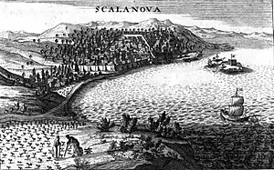 Pitton de Tournefort calls the hill "Cape Scalanova, which projects greatly into the sea." He is at a loss to explain the etymology of the name, calling it an "Italian name that the Franks gave to it perhaps after the destruction of Ephesus." By Franks one must understand any European. Apparently the Venetians, who had their own Italic language must be Franks, or else Pitton de Tournefort was unaware of the Venetian hegemony. He suggests that Scalanova is a transcription of "the ancient name of Neapolis of the Milesians," but does not elucidate with any literary references. He identifies Scalanova with Turkish Cousada.