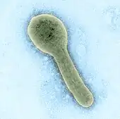 Like all filoviruses, marburgvirions are filamentous particles that may appear in the shape of a shepherd's crook or in the shape of a "U" or a "6", and they may be coiled, toroid, or branched.[18] Marburgvirions are generally 80 nm in width, but vary somewhat in length. In general, the median particle length of marburgviruses ranges from 795 to 828 nm (in contrast to ebolavirions, whose median particle length was measured to be 974–1,086 nm), but particles as long as 14,000 nm have been detected in tissue culture.[19]
