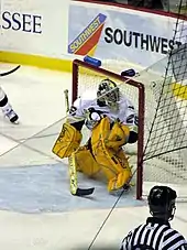 Fleury immediately made his NHL debut in 2003–04 as the youngest goaltender in the league at 18 years old (three years younger than the second-youngest, Rick DiPietro of the New York Islanders).[7] He appeared in his first NHL game on October 10, 2003, against the Los Angeles Kings, recording an impressive 46-save performance, which included a penalty shot save, in a 3–0 loss.[8] Fleury recorded his first NHL win in his very next start, on October 18, with 31 saves in a 4–3 win over the Detroit Red Wings.[9] His first NHL shutout came on October 30, in a 1–0 victory over the Chicago Blackhawks.[9] Fleury shared time with goaltenders Jean-Sébastien Aubin and Sébastien Caron[10] and lived up to first-overall-pick expectations early, earning Rookie of the Month honours in October with a 2–2–2 record, 1.96 goals against average (GAA) and .943 save percentage.[7] As the season progressed, however, his performance began to sink, mainly due to Pittsburgh's poor defence.[9][10] The team regularly gave up over 30 shots per game, and rarely managed to become an offensive threat.[11] He was loaned to Team Canada for the 2004 World Junior Championships in December and, upon returning with a second consecutive silver medal, he was sent back to the QMJHL on January 29, 2004.[10] In light of financial difficulties for the franchise, it is believed Fleury's $3 million contract bonus, which he would have potentially received if he stayed and met several performance goals, was a factor in the decision to return him to Cape Breton.[10] To no avail, Fleury offered to forfeit his bonus to remain with the club.[12] Fleury finished the QMJHL season with Cape Breton in a first round elimination and was subsequently assigned to Pittsburgh's American Hockey League (AHL) affiliate, the Wilkes-Barre/Scranton Penguins, and appeared in two post-season games.