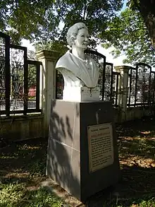 Several commemorative figures were created in remembrance of Agoncillo's historic family. On November 27, 1955, a marker was erected by the National Historical Institute of the Philippines and a museum was established in Taal, Batangas in accordance with her last wish and was named Marcela Mariño de Agoncillo Museum and Monument. The museum is Mariño-Agoncillo's ancestral house.[8][32] The house-turned-museum permanently exhibits flags and a diorama depicting the sewing of the first flag. A bronze statue of her holding the flag was erected outside the house in its garden.[33] In Hong Kong, a historical marker was created by the Hong Kong Antiquities Council at Morrison Hill Park to commemorate the site where the first Philippine flag was sewn. However, the place where the Agoncillos resided, the location of the Hong Kong Junta, and other locations of historical importance to Filipinos remain unmarked.[34]