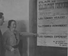 In an interview with Paris-Soir, Marcelle Lafont presented her manifesto: Le respect des consciences, le respect de la mère et de l'enfant, l'enseignement ménager obligatoire, l'espéranto dans les programmes scolaires et le développement de la pratique des sports. (Respect for consciences, respect for mothers and children, compulsory domestic education, esperanto in the school curriculum and the development of sports". She also explained: "We are women of no party, we are women".[2]