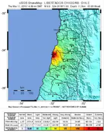 - 1 2 3 4 "Magnitude 6.9 – LIBERTADOR O'HIGGINS, CHILE". United States Geological Survey. 11 March 2010. Archived from the original on 13 February 2013. Retrieved 2 September 2010.
