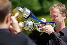 Marco Blaauw plays a double bell trumpet. The first model was made by Dieter Gaertner in Düren, Germany, with whom Blaauw had previously worked on various C trumpets. This instrument inspired composer Péter Eötvös to write the first piece for the instrument – "Snatches of a Conversation" – which Blaauw premiered and recorded.[6] In the relatively short life of the double bell trumpet, Marco Blaauw has generated a huge amount of new repertoire for the instrument and helped spearhead development of other double bell brass instruments (now used by Ensemble Musikfabrik).