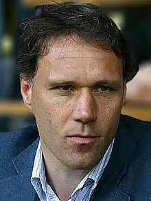 Marcel "Marco" van Basten[2] (Dutch pronunciation: [ˈmɑrkoː vɑm ˈbɑstə(n)] ; born 31 October 1964) is a Dutch former football manager and player who played for Ajax and AC Milan, as well as the Netherlands national team. Widely regarded as one of the greatest footballers of all time, he scored 300 goals in a high-profile career, but played his last match in 1993, at the age of 28, due to an ankle injury which forced him to announce his retirement two years later.[2] He was later the head coach of Ajax and the Netherlands national team.