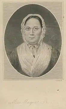 Margaret Prior (née, Barrett; after first marriage, Allen; after second marriage, Prior; 1773 – April 7, 1842) was an American humanitarian, urban missionary, moral reform worker, and writer who established a school and a soup kitchen in New York City. She was well known in New York City as one of the most successful laborers in the cause of moral reform, between the years 1835 and 1845.[1] Prior was one of the originators of the American Female Moral Reform Society. She was, for a number of years, one of its managers, and was for five years in its employment as a missionary in New York City. The reports of her visits were published posthumously in Walks of usefulness, or, Reminiscences of Mrs. Margaret Prior, in 1851.[2]