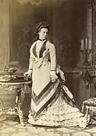 During a visit to her maternal relatives, the Princes of Battenberg, at Jugenheim in August 1868, Grand Duchess Maria Alexandrovna, then fourteen years old, met Prince Alfred, Duke of Edinburgh.[23][24][25][26] Alfred, Queen Victoria's second son, was a shy and handsome young man, with a career in the British navy.[27][28] He was visiting his sister, Princess Alice, who was married to Maria's first cousin.[25] Alfred's voyage around the world with the Royal Navy kept him away, traveling for the next two years.[29] Maria and Prince Alfred saw each other again in the summer 1871, when Alexander II and his wife visited the Battenbergs again at their palace. The Emperor and Empress were accompanied by seventeen-year-old Maria and her two elder brothers. Alfred also happened to be there, along with the Prince and Princess of Wales. During that summer, Maria and Alfred felt attracted to each other, spending their days walking and talking together. They had a common love of music; Alfred was an enthusiastic amateur violinist, while Maria played the piano.[30] Although they wished to marry, no engagement was announced, and Alfred returned to England. Their parents were against the match. Alexander II did not want to lose his daughter, to whom he was deeply attached.[31] He presented his daughter's youth as the main obstacle and suggested a waiting period of at least one year before any definitive decision should be taken.[32] The Emperor also objected to a British son-in-law, due to the general anti-British feeling in Russia following the Crimean War.[33] The Empress regarded the British customs as peculiar and the English people as cold and unfriendly. She was convinced that her daughter would not be happy there. However, marriage negotiation began in July 1871, only to be stalled in 1872.[34]
