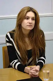 Maria Valeryevna Butina (Russian: Мари́я Вале́рьевна Бу́тина, sometimes transliterated as Mariya Butina; born November 10, 1988) is a Russian politician, political activist, journalist, and former entrepreneur who was convicted in 2018 of acting as an unregistered foreign agent of Russia within the United States.[1][2][3]