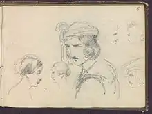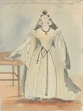 One of the most attaching parts of the collection, this section holds several artworks given to the diva during her tournées, such as this very delicate, signed and dated bust of white marble,[4] a large gold medal commemorating her interpretation of Norma at La Scala (1836) and some fifteen portraits of her – lithographs, black-lead drawings, pastels or photographic reproductions – including an interesting lithograph (1851) from her nephew Léon Viardot. Other documents have a more sentimental value: they include Malibran's travel watercolours as well as a small sketchbook by her hand, revealing her unsuspected drawing talent. This aptitude also transpires in the two surprising La Réforme du Théâtre volumes, an initiative of the singer to modernize theatre costumes and assembling some fifty colour projects.