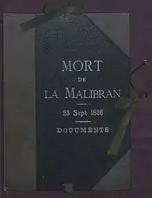 This last part includes documents related to Malibran's death – in particular the original act,[5] on parchment, by which the ecclesiastical authority of Manchester authorizes, following the demand of Charles Auguste de Bériot, the exhumation and transfer of the body to Belgium, as well as the French translation[6] of the poignant funerary report made in London by Malibran's GP, Dr. Jos Belluomini, who stayed at her bedside for a week and attested her death on the morning of 23 September 1836.