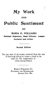 - 1 2 "My work and public sentiment; By Maria P. Williams; National Organizer; Good Citizens League lecturer and writer. [Title page]". NYPL Digital Collections. Retrieved 2019-02-23.