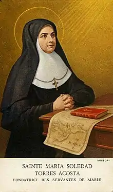 María Soledad Torres y Acosta (2 December 1826 – 11 October 1887) - born Manuela - was a Spanish Roman Catholic professed religious and the founder of the Servants of Mary. Her apostolic actions - and those of her order - were dedicated towards the nursing of the sick and the poor in the places that it operated in.[1] Torres' childhood consisted of the desire to join the religious life and managed to join a priest's fledgling religious cluster of women after the Dominicans refused to admit her due to her frail constitution. But a series of struggles saw her in a conflicted position of leadership that saw her removed and reinstated twice.