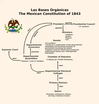 Despite the key role he had played in establishing the new Bases of Tacubaya, Paredes was not invited to accept any position within it, as he was perceived to lack the talents for political administration. He was simply sent back to his post as commander general of Jalisco. Nonetheless, he remained loyal to Santa Anna. The congress which was elected proved itself to be federalist and on 11 December 1842, the Plan of Huejotzingo, which Paredes supported, called for the government to shut down the congress and replace it with a council of notables to continue the work of redrafting the constitution. The plan gained enough support to work and on 6 January 1843, a body of eighty prominent centralists known as the Junta Nacional instituyente was appointed by the government to write a new constitution.[7] The Junta produced a new constitution known as the Bases Orgánicas on June 12, 1843.