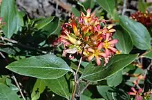 Marianthus ringens is a woody shrub or climber with silky hairy new shoots that become glabrous as they age. Its adult leaves are elliptic, thick, 80–105 mm (3.1–4.1 in) long and 9–22 mm (0.35–0.87 in) wide on a petiole up to 10 mm (0.39 in) long. The flowers are borne in dense clusters, the five sepals 3–4 mm (0.12–0.16 in) long and creamy-red. The five petals are yellow grading to orange-red, 12–21 mm (0.47–0.83 in) long and darken as they age. Flowering occurs in August and September and the fruit is a thin, spindle-shaped capsule 7–9 mm (0.28–0.35 in) long and 3–4 mm (0.12–0.16 in) in diameter.[2][3]