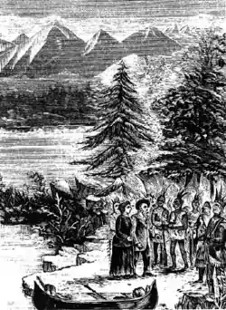 Before his marriage, Jean-Baptiste had previously been involved à la façon du pays (in the style of the country) with a native woman who had borne his children. Marie-Anne was tolerant and accepting of the children arising from this previous relationship, although the other woman was jealous and reportedly threatened to poison her.[9] Despite this incident, the Lagimodières generally had good relationships with the Aboriginal peoples they encountered. Marie-Anne was often regarded as an object of curiosity by the Natives during her travels as she was invariably the first white woman they had ever seen (some were even led to believe that she possessed supernatural powers).