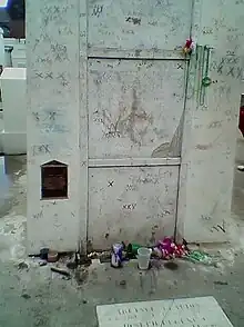 Laveau's name and her history have been surrounded by legend and lore. She is generally believed to have been buried in plot 347, the Glapion family crypt in Saint Louis Cemetery No. 1, New Orleans,[28] but this has been disputed[29] by Robert Tallant, a journalist who used her as a character in historical novels.[8] Tourists continue to visit and some draw X marks in accordance with a decades-old tradition that if people wanted Laveau to grant them a wish, they had to draw three X's on the tomb, turn around three times, knock on the tomb, yell out their wish, and if it was granted, come back, circle their X, and leave Laveau an offering.[29]