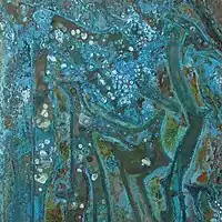 Her works vary from single squares of bronze, copper or brass, patterned and coloured by immersion in acids, or by having their aging process speeded up through natural and chemical means, to complex portraits made up of thousands of small squares, given individual patination by various processes.