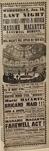 Back in Britain, from 28 January to 2 February 1850 she was with Franconi's Circus in Birmingham, before embarking on an extensive tour of the provinces touring from 1850 to 1853 as "the only real troupe of lady equestrians" with her and her husband's newly-formed Macarte and Bell's Grand American Circus - actually quite a small circus by the standards of the time - which was owned by her husband Michael Macarthy, his brother Dan and Dick Bell.[2] In 1853 their circus was joined by the famous clown Thomas Barry.[10][11]